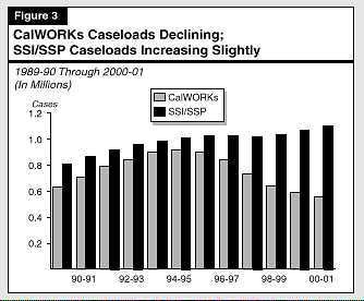 CalWORKs and SSI/SSP Caseloads. Figure 3 shows the caseload trend for the CalWORKs and SSI/SSP programs. While the number of cases in SSI/SSP is greater than in the CalWORKs program, there are more persons in the CalWORKs program--about 1.5 million compared to about 1 million for SSI/SSP. (The SSI/SSP cases are reported as individual persons, while CalWORKs cases are primarily families.)