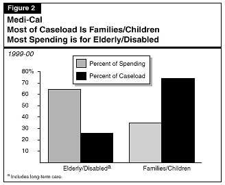 The average cost per eligible for the aged and disabled Medi-Cal caseload (including long-term care) is much higher than the average cost per eligible for families and children on Medi-Cal. As a result, almost two-thirds of Medi-Cal spending is for the elderly and disabled, although they account for only about one-fourth of the total Medi-Cal caseload, as shown in Figure�2.