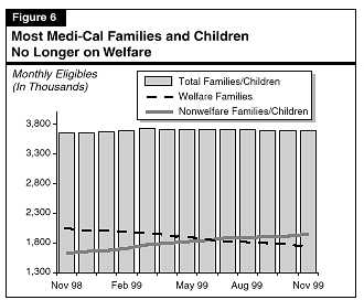 In July 1999, as shown in Figure�6, the Medi-Cal Program reached a milestone. For the first time in the program's history, welfare recipients accounted for less than half of the families (including pregnant women) and children enrolled in Medi-Cal. Medi-Cal began as a program to provide health care to welfare recipients. Most of the elderly and disabled persons in Medi-Cal continue to be welfare (SSI/SSP) recipients, but the combination of declining family welfare (CalWORKs) caseloads, expanded eligibility for families and children who are not on welfare, and stronger outreach efforts has reduced the CalWORKs share of families and children in Medi-Cal to less than half.