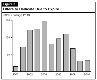 As noted above, the commission can require OTDs as a mitigation measure for approving coastal development permits. Typically, these OTDs expire after 21 years unless they are accepted by an appropriate entity. As shown in Figure�2, about 900 OTDs will expire over the next decade unless they are accepted.