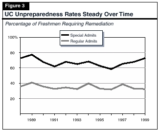 Unpreparedness Has Remained Relatively Constant at UC. Figure 3 shows the UC systemwide unpreparedness rate in writing for regularly and specially admitted freshmen over the last decade. In fall 1988, 35 percent of regular admits and 74 percent of special admits were unprepared for college-level writing. By fall 1999, these percentages had changed only slightlyto 32 percent and 73 percent, respectively. (During these years, approximately 5 percent of all freshmen were specially admitted.)