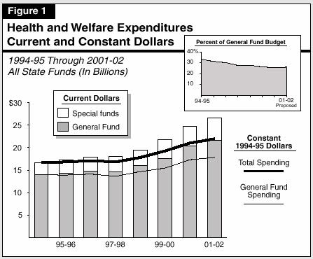 The budget proposes General Fund expenditures of $21.6 billion for health and social services programs in 2001-02, which is 26 percent of total proposed General Fund expenditures. As shown in Figure 1, the health and social services share of the budget generally has been declining since 1994-95, but would increase slightly compared to the prior year under the Governor's 2001-02 budget plan. The budget proposal represents an increase of $1.3 billion, or 6.3 percent, over estimated expenditures in the current year.
