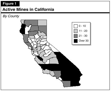 Figure 1 shows the geographical distribution of the approximately 1,000 active mines in the state. All counties except oneSan Franciscohave active mines. The counties with the largest number of active mines are San Bernardino, Inyo, Riverside, Humboldt, Imperial, and Kern. For some counties, such as Trinity and Humboldt, mining is a large portion of the local economy. In other counties, such as San Bernardino and Kern, mining is of less economic importance due to a more diverse economic base. The types of materials mined throughout the state vary greatly. More than half of the state's active mines are sand and gravel mines. Stone and rock mines account for another 10 percent.