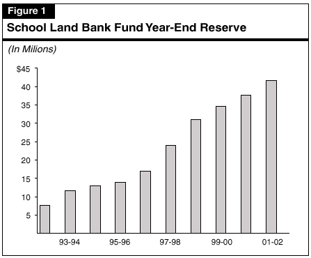 Budget Projects $42 Million Reserve for 2001-02. Since 1996, land sales have added another $15.8 million to the fund, while the fund has earned an additional $5.2 million in interest. However, at the time this analysis was prepared, SLC still had expended almost no money from SLBF for new investments. (The SLC has expended less than $100,000 from the fund for its operating costs.) As shown in Figure 1 (see next page), the fund is expected to have a reserve of $42 million at the end of 2001-02. This is almost triple the fund balance when the Legislature last examined the issue in 1996.