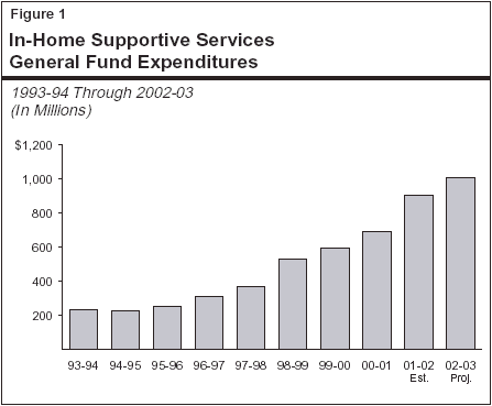 General Fund Spending Has Nearly Quadrupled. From 1993-94 through 2001-02, IHSS has been the fastest growing social services program in terms of General Fund spending. During this time period, General Fund expenditures increased almost four-fold, rising from $232 million in 1993-94 to an estimated $903 million in 2001-02. This represents an average annual growth rate of about 19 percent. By comparison, General Fund spending in CalWORKs declined during this period and SSI/SSP spending increased at an average annual rate of 4 percent. For 2002-03, the budget proposes about $1 billion for IHSS, just less than the combined General Fund spending for Foster Care and Child Welfare Services. In-Home Supportive Services is now the third largest social services program, behind only SSI/SSP ($3 billion) and CalWORKs ($2.2 billion). Figure 1 shows General Fund spending from 1993-94 through 2002-03.
