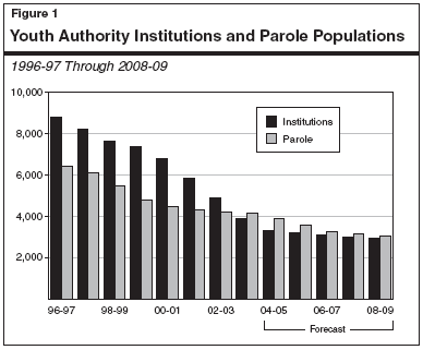 The number of parolees is projected to increase just slightly from 3,755 wards at the end of the current year to just under 3,790 by the end of the budget year, and then decrease to 2,970 by the end of 2008-09 (June 2009). Figure 1 shows the Youth Authority's institutional and parolee populations from 1996-97 through 2008-09. As the figure shows, beginning in 2003-04, the parole population is slightly greater than the institution population and is projected to remain greater through 2008-09. This is primarily a result of (1) a declining rate of new admissions into the Youth Authority and (2) an increasing average length of time that a ward is on parole.