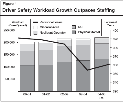 While the staffing level has declined, the driver safety branch's workload has increased. As Figure 1 also shows, between 2000-01 and 2003-04 the total number of cases opened by driver safety offices increased by over 14,000 (7 percent), to 215,000. While the amount of negligent operator cases has decreased and DUI totals are relatively unchanged, overall workload has grown due to increases in cases involving motorists who may be physically or mentally unfit to drive safely (P&M). In fact, between 2000-01 and 2003-04, P&M workload increased by 20,000 cases (19 percent), from 107,000 to 127,000. Totals for the current year are expected to be even higher. Overall, P&M cases account for 60 percent of driver safety's workload, while DUI cases make up almost 30 percent. Negligent operator cases account for about 10 percent of total workload.