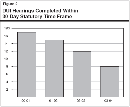 The DMV's ability to meet the statutory deadline for administrative hearings has continued to decline in the past few years. As Figure 2 shows, in 2003-04, only 8 percent of hearings were held within 30 days of arrest. This is down from 17 percent in 2000-01. The average length of time before a hearing could be held in 2003-04 was 53 days, compared to 46 days in 2000-01. Such delays undercut the purpose of the law, which is to protect public safety by facilitating the timely removal of dangerous drivers from the roadways, and reduce the law's effectiveness.